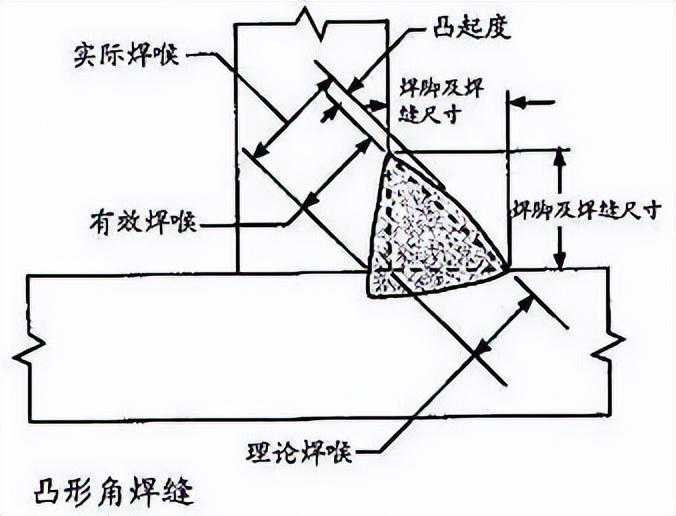 确定角焊缝尺寸时,必须先清楚角焊缝是凸型还是凹型,凸形指焊缝表面隆起产生轻微外凸,它与凸起高度有关。角焊缝的凸起高度与坡口焊缝的加强高相同。