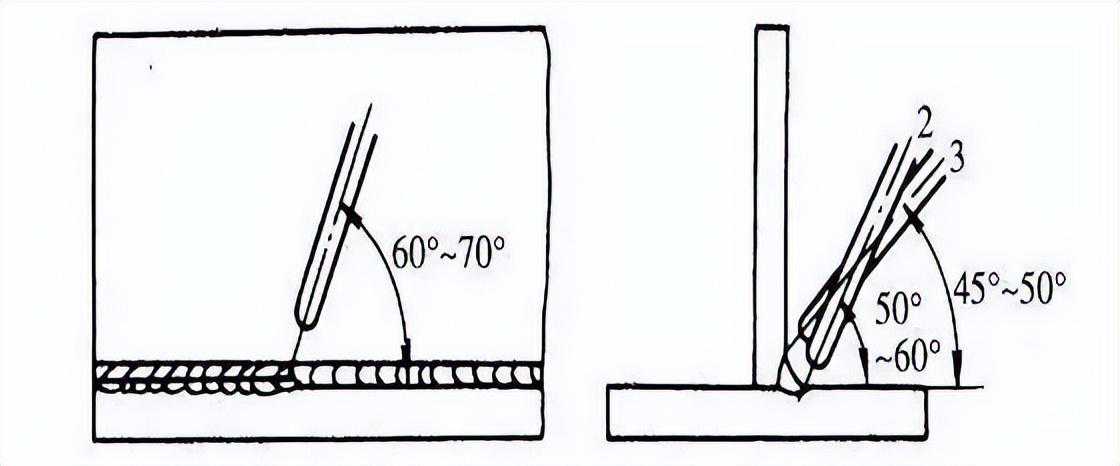根部平角焊的焊条角度如图所示:采用右焊法,在试板左侧引弧,短弧焊。采用直线运条方式,向右焊接,电弧对准根部顶角,压低电弧,保证顶角和两侧板熔合。打底焊时摆动方法采用直线运条,不摆动快速焊接,这样可以达到所需要的熔深。