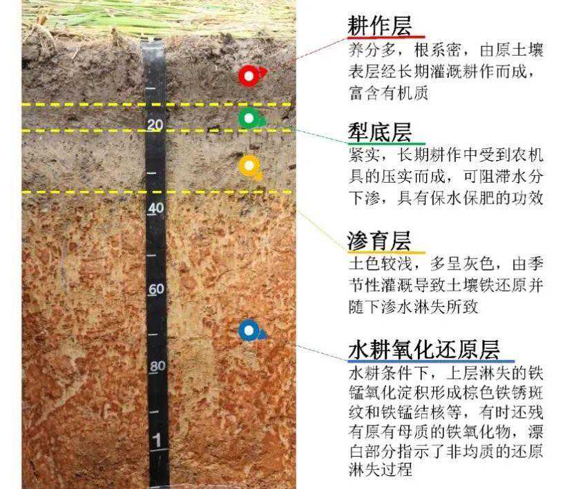 水耕人为土的诊断标准:具有人为滞水水分状况和水耕表层(耕作层和犁底层)及水耕氧化还原层。