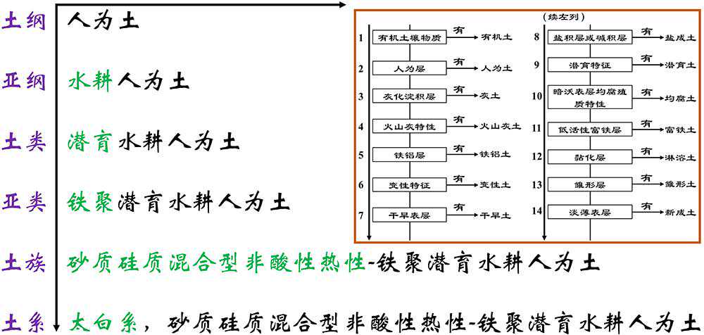 比如,在“铁聚潜育水耕人为土”这一亚类中,“人为土”、“水耕”、“潜育”和“铁聚”分别对应的是土纲、亚纲、土类和亚类的性质。土族的命名是在亚类前叠加反映土壤分异特性的名词,例如“砂质硅质混合型非酸性热性”。土系调查面向的是土壤实体,它的命名可以采用该土系代表性剖面点位或者首次描述该土系的所在地的标准地名直接定名,比如“太白系”、“西林系”。