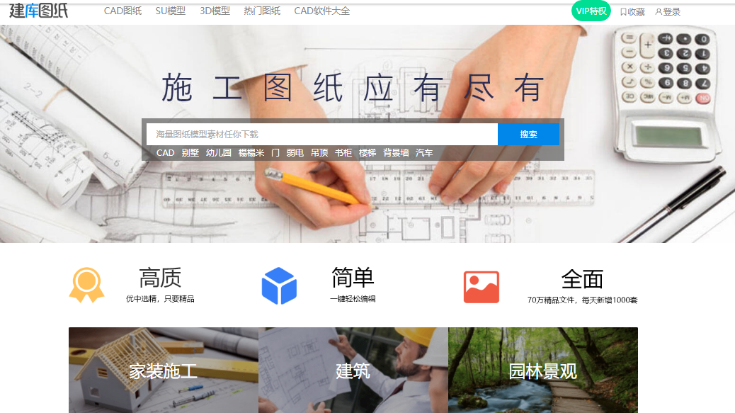 建库图纸,一看名字就知道,这里有很多CAD图纸资源,需要什么样的图纸直接在搜索框进行搜索就行,比如别墅、榻榻米、门、吊顶、书柜、楼梯、背景墙、幼儿园等等,或者直接搜索CAD,也能快速找到大量图纸。
