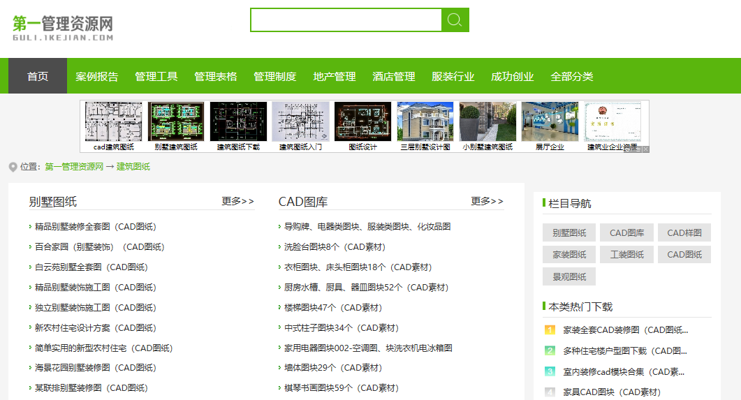 第一管理资源网,这个网站上有很多CAD图纸资源,比如精品别墅装修全套图、独立别墅装饰施工图、新农村住宅设计方案、海景花园别墅装修图、洗脸台图块、导购牌、电器类图块、服装类图块、化妆品图、衣柜图块、床头柜图块、厨房水槽、厨具、器皿图块、楼梯图块、中式柱子图块、家用电器图块、墙体图块、琴棋书画图块等等。