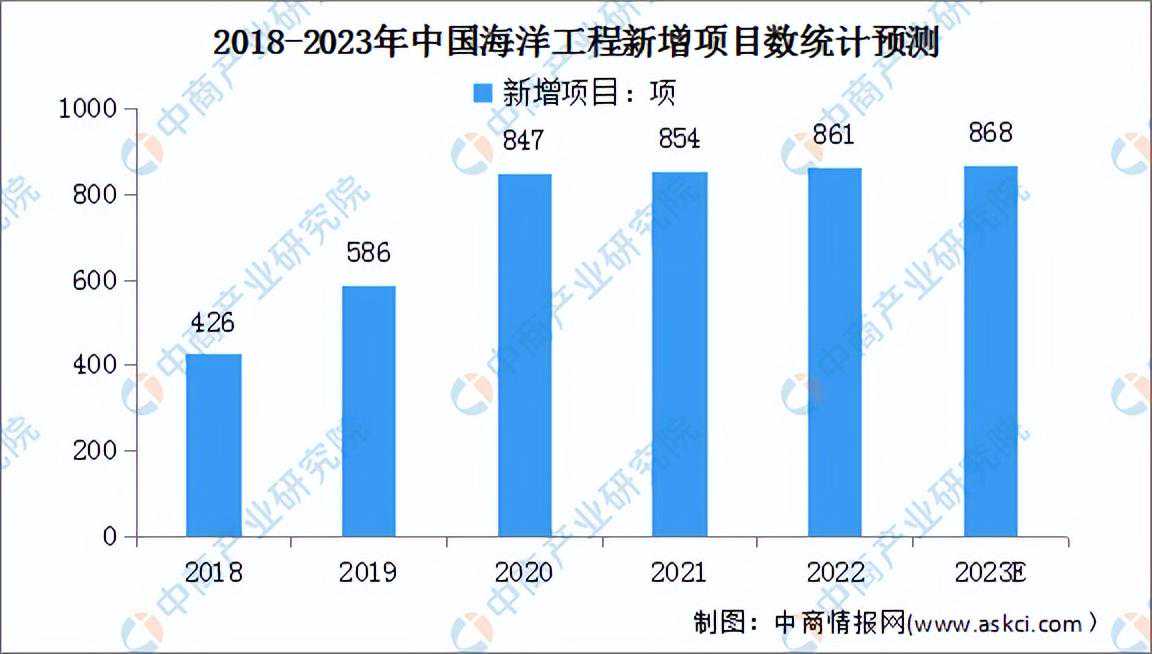 近年来,我国海洋工程新增项目随着中国海洋工程装备需求量增加而增加。数据显示,2018-2022年中国海洋工程新增项目持续增加,其中2022年新增项目为861项。中商产业研究院预测,2023年中国海洋工程新增项目将达868项。