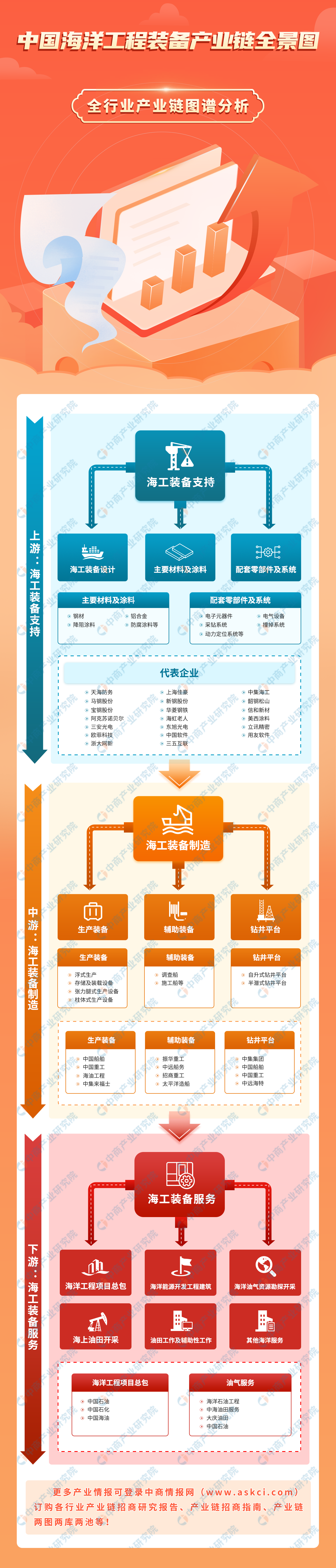 海洋工程装备上游包括海工装备设计、主要材料及涂料、配套零件及系统;中游包括生产装备、辅助设备、钻井平台;下游应用于海洋工程项目总包、海洋能源开发工程建筑、海洋油气资源勘探开采、海上油田开采、油田工作及辅助性工作等。