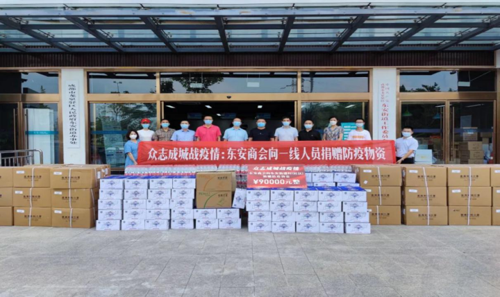 7月26日,东安商会集中向龙泉驿区东安街道7个村(社区)坚守在疫情防控一线的医护人员、基层干部、居民骨干、志愿者等赠送了10万个医用口罩、2万副医用手套和700件矿泉水。