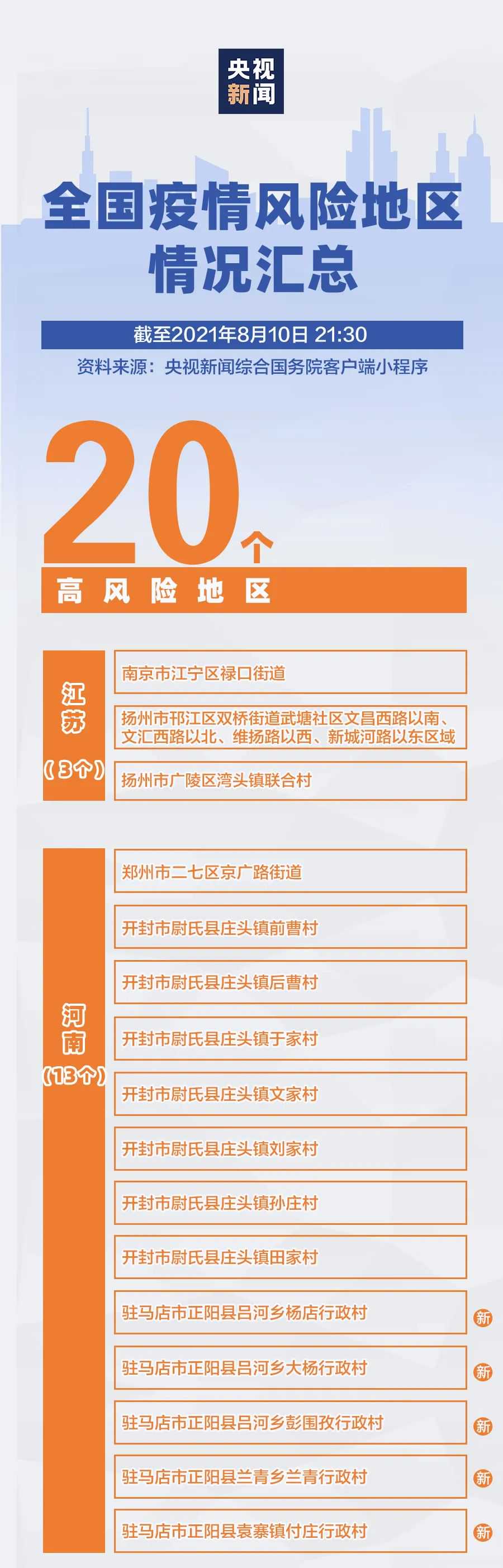 高中风险区↑20+212截至8月10日21:30,全国有20个高风险地区,212个中风险地区。