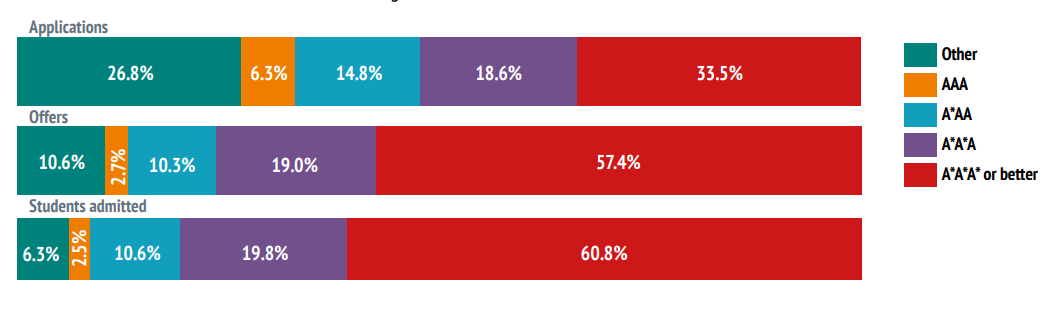 超66.9%的申请者与约91.2%获得录取的学生成绩都达到A*AA或以上。