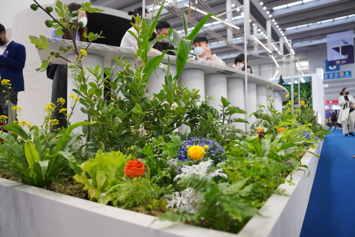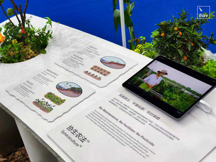 观众从入口进入,走过主题介绍区后,映入眼帘的就是索尼开发的环境友好型创新材料展示和索尼增广生态系统「协生农法(Synecoculture)」的种植物展示。比较令人感到惊奇的是,展台周边的所有植物都是经由协生农法栽培而成的,都是正在生长着的鲜活植物。