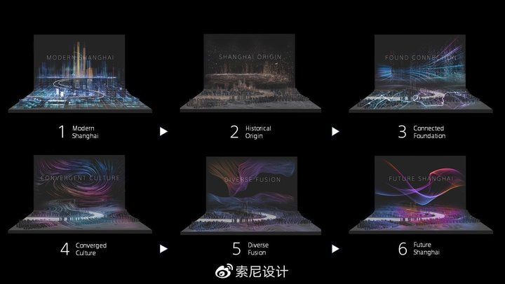 他们在一个L形的舞台上,设计了一个由2D立面与3D模型面组成的沙盘,配合4台索尼激光投影机,将富有不同意义的视觉要素,色彩和音乐效果,应用于每一章节,为观众打造一种沉浸式观看体验,得以身临其境感受北外滩的魅力与潜力。