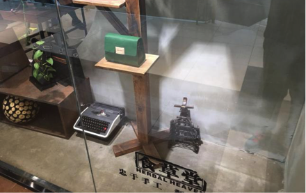 店面设计融入很多手工的元素,如,打字机、工具等。