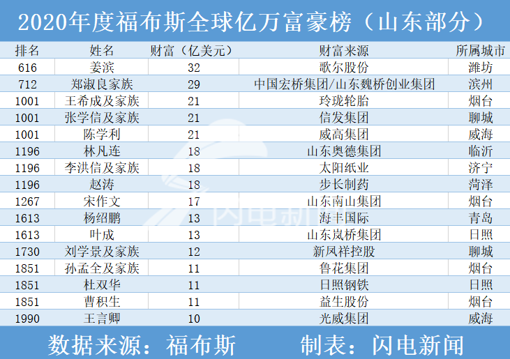 齐鲁网·闪电新闻4月84月7日晚间,福布斯发布第34期全球亿万富豪榜。在这份榜单中,全球共有2095位亿万富豪上榜,中国内地有389位富豪上榜,山东省共计16位富豪入选该榜。