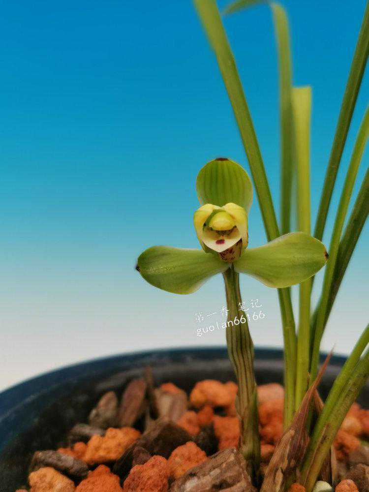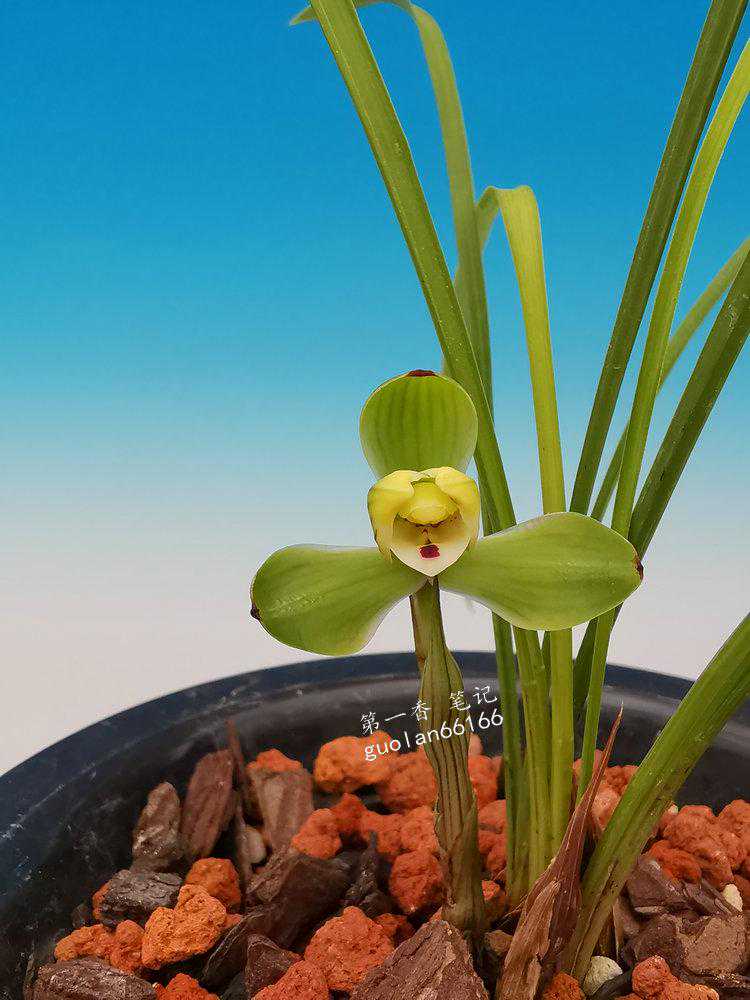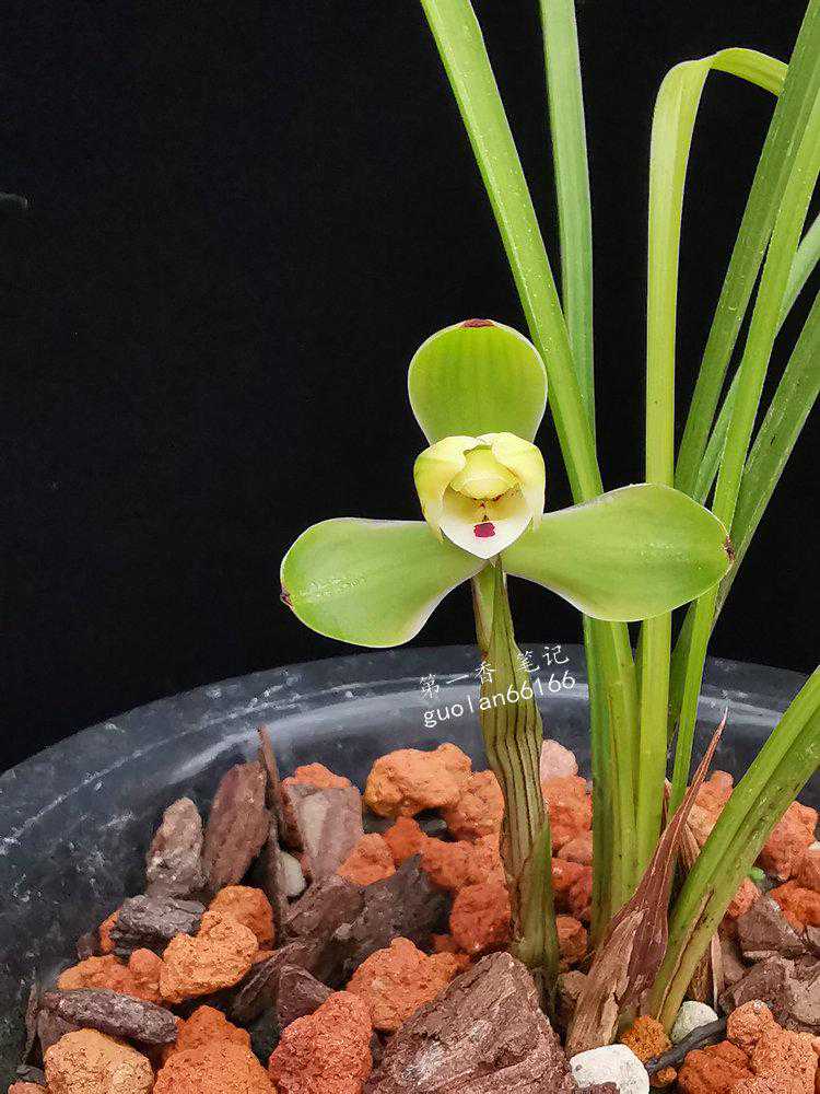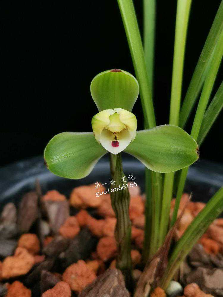 特征:株型紧凑,叶姿挺立微带弓垂,叶片5-6张,质感硬糯,色翠绿,有光泽。叶面呈深“V”字型,缘齿细,叶尖尖锐有芒刺状。叶长22-29厘米,宽仅0.7-0.9厘米;花艺,梅瓣。五瓣分窠,拱抱绽放。外三瓣短圆、紧边起兜,大圆头细收根、肩平,偶尔有飞肩状开品。瓣长2.7厘米,宽1.2厘米,直径5厘米左右。观音兜捧心合抱蕊柱,长2厘米,宽1.2厘米。刘海舌微宕,有白舌和红点分布两种显现。长1.5厘米,宽1.2厘米。花色不净有紫红筋纹分布;新芽淡紫红色,尖锋有米粒状晶体;脚壳厚硬斜出;
