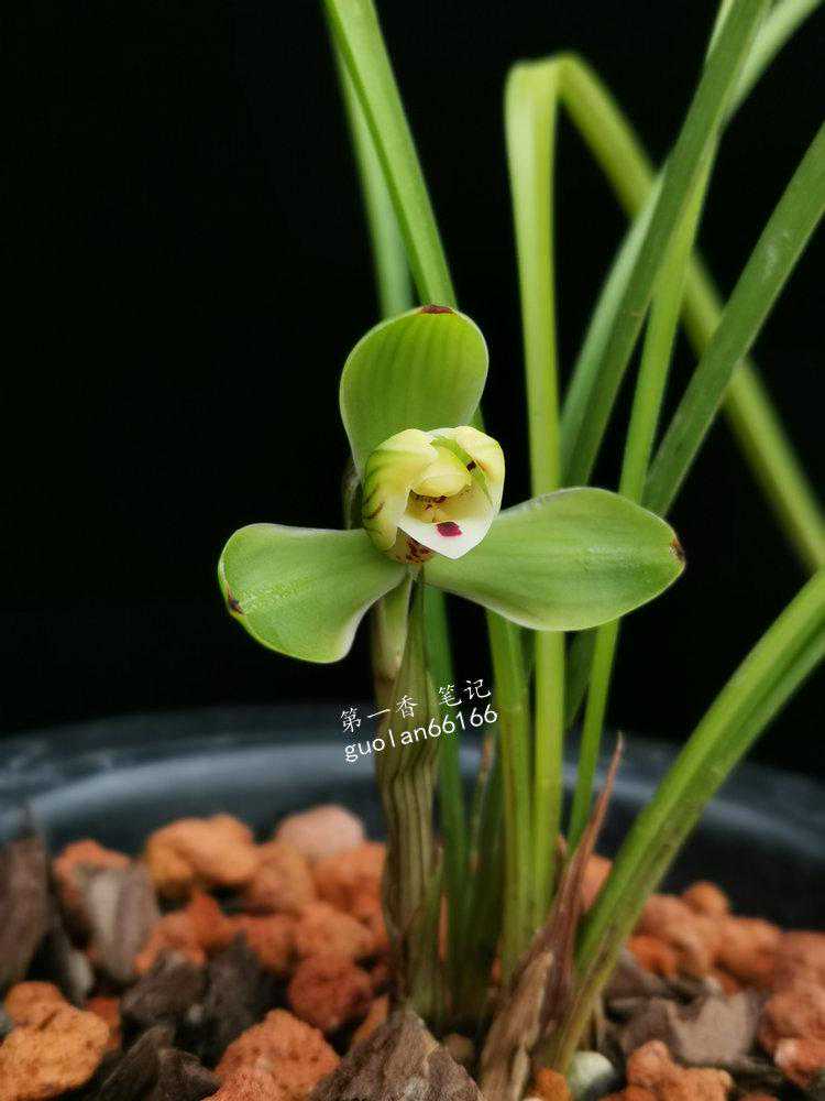 鉴赏:梅瓣,五瓣分窠。外三瓣短圆、收根、肩平,偶有飞肩状开品,观音兜捧心,刘海舌,花色不净。春兰梅瓣中上乘之品,有人说可与“宋梅”相媲美亦有一定的道理。