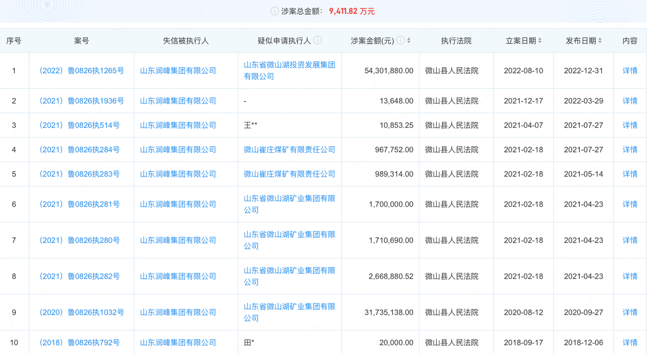 由于为润峰集团借款、担保也让崔庄煤矿及其母公司微山湖矿业集团损失惨重,现如今,润峰集团已经接连十次成为失信被执行人,其中涉及到崔庄煤矿及其母公司微山湖矿业集团的案件就多达六条,六条申请执行案件的涉案金额接近4000万元。