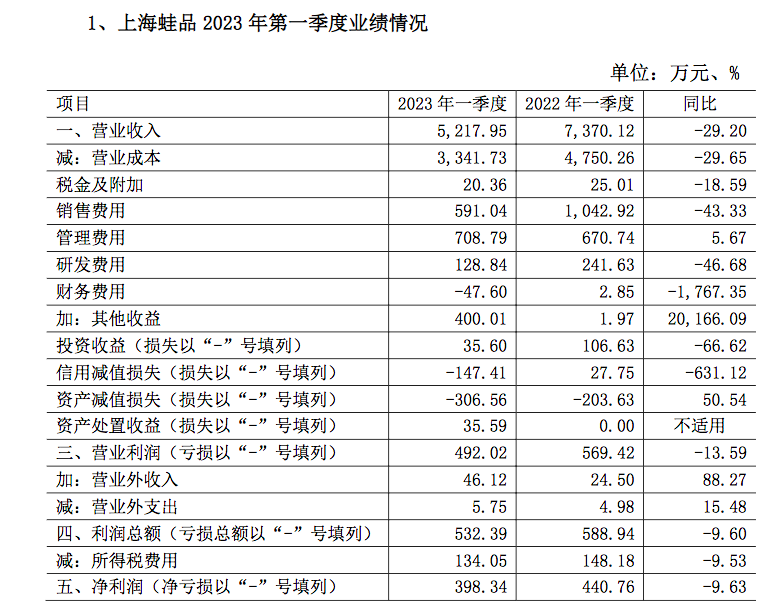 回应公告还显示,2023年第一季度上海蛙品实现了扭亏为盈,单季度净利润为398万元。但一季度的业绩依然出现了双降局面:一季度营业收入同比下滑29.29%,净利润同比下滑9.63%,扣除非经常性损益后净利润同比下滑95.48%。