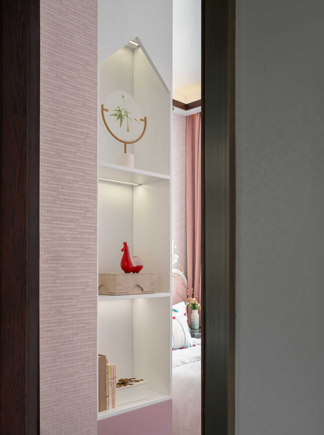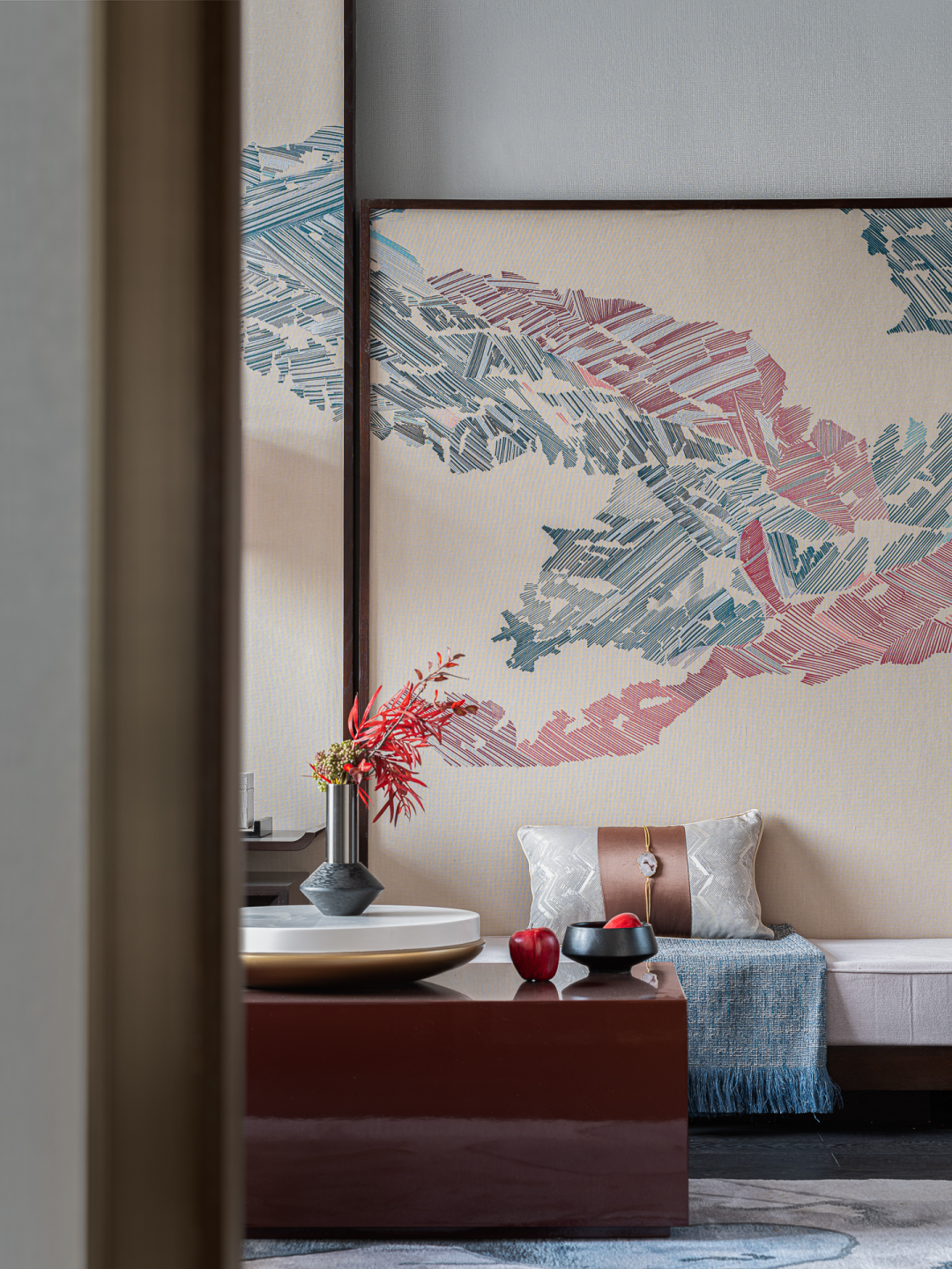 在空间中延续唐代风格中端雅稳重的设色意图,在古朴雅致的形体与悦目的摆件烘托下,氤氲意境,唐代韵律和谐的艺术特质一展无遗。