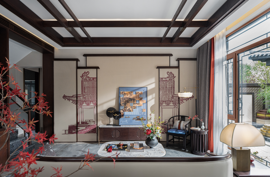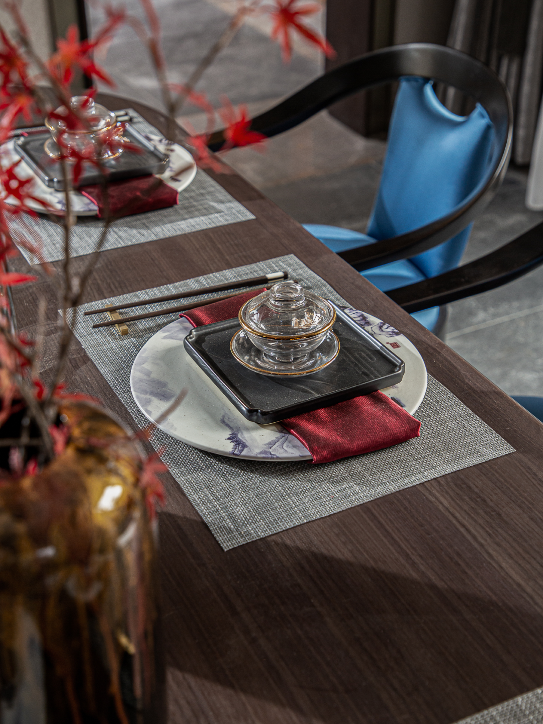 红叶烂漫,茶味清甜,长榻松软,空间整体营造出一种气质独到的唐代美学旨趣,生活在氤氲中更显淡之况味。