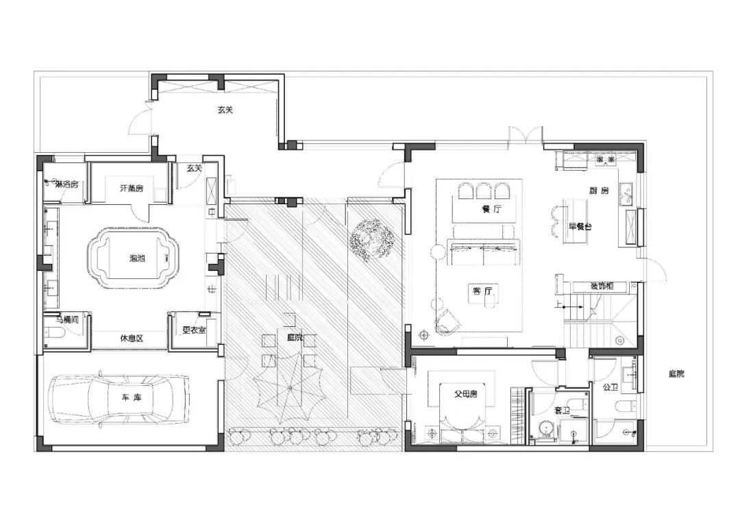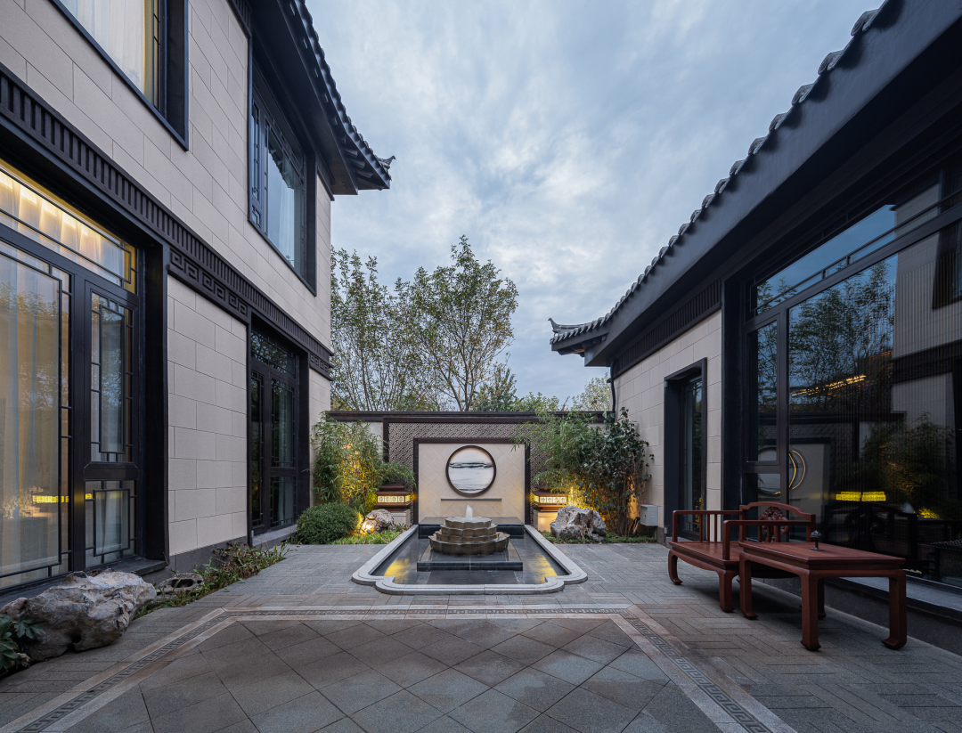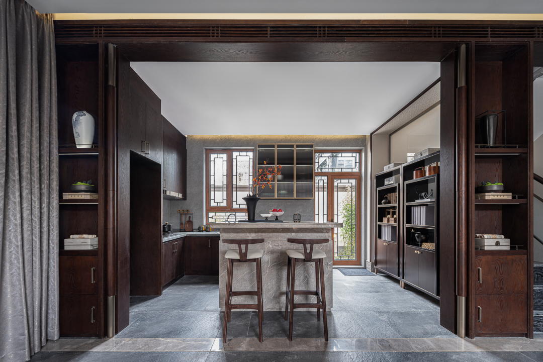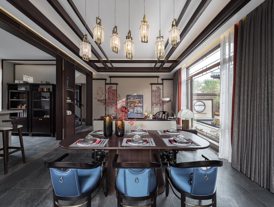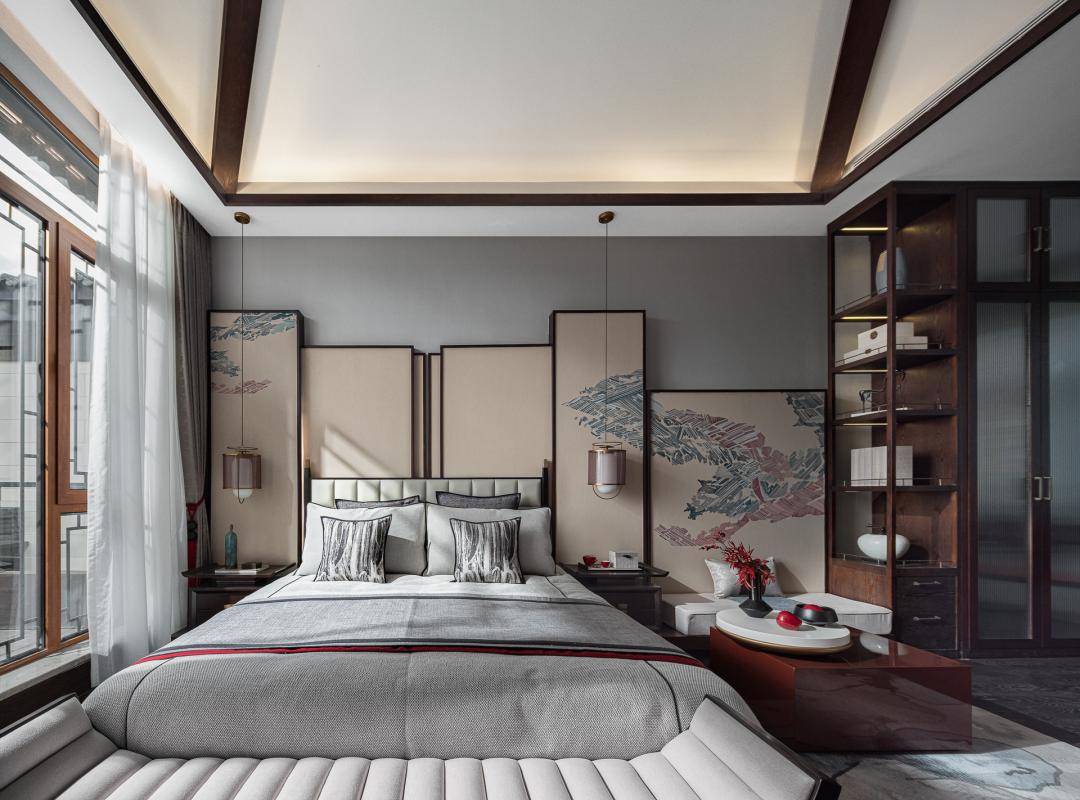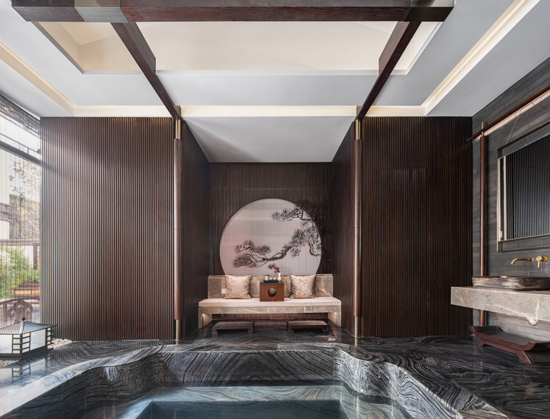 为华丽的唐风色彩加入现代语汇,将其宁静又纯粹的现代氛围与中式长轴空间揉合,集结唐朝精致文化并融合现代美学,在喧闹的城市中创造简约宁静却气势奔放的新中式空间,不流于世俗的一昧仿唐,空间的自由于山水云雾之间展开,独树一格。