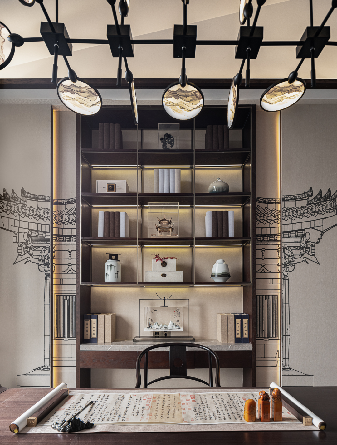 富有传统韵味的字画,饰品摆件等点缀,叠落出唐代古朴雅致的韵律之美,营造一隅清雅恬淡的文人精神世界。