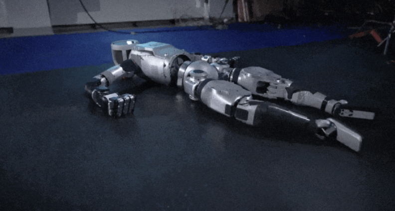预告片里,俯卧在地的Atlas,随着镜头的拉近,Atlas抬起双腿,膝盖开始向后反转,呈现反关节状态,不用手臂支撑,直接站起,随后身体和头部也开始180度旋转,从背对变成了正对镜头。