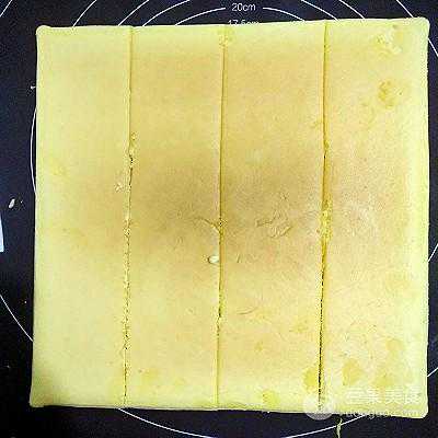5、蛋糕卷可以参考我前面菜谱,抹茶蛋糕卷制作,把烤好晾凉的蛋糕,切出四条一样长度的条状