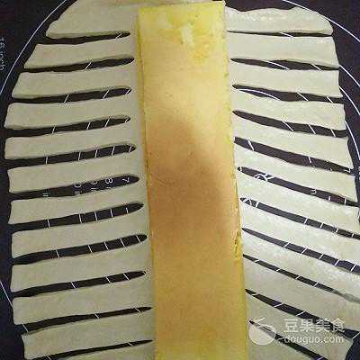 7、取一个面团擀成长方形,跟蛋糕一样的长度,把蛋糕放中间,用切面刀从两边切出一样的十条长度