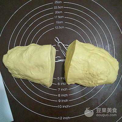 4、面团发酵两倍大时,揉开排气分成两等份,用保鲜膜包住醒发15分钟