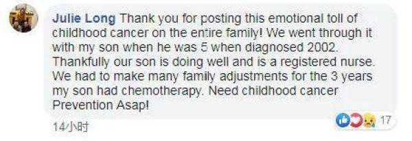 “谢谢你把这一切分享给我们,儿童癌症带给家人的严重影响是十分大的。我们也经历过。在2002年,我5岁的儿子被诊断出患有白血病。幸好我儿子现在很好,而且他已经成为一名专业护士。我们整个家庭也经历了3年的重大变化。”