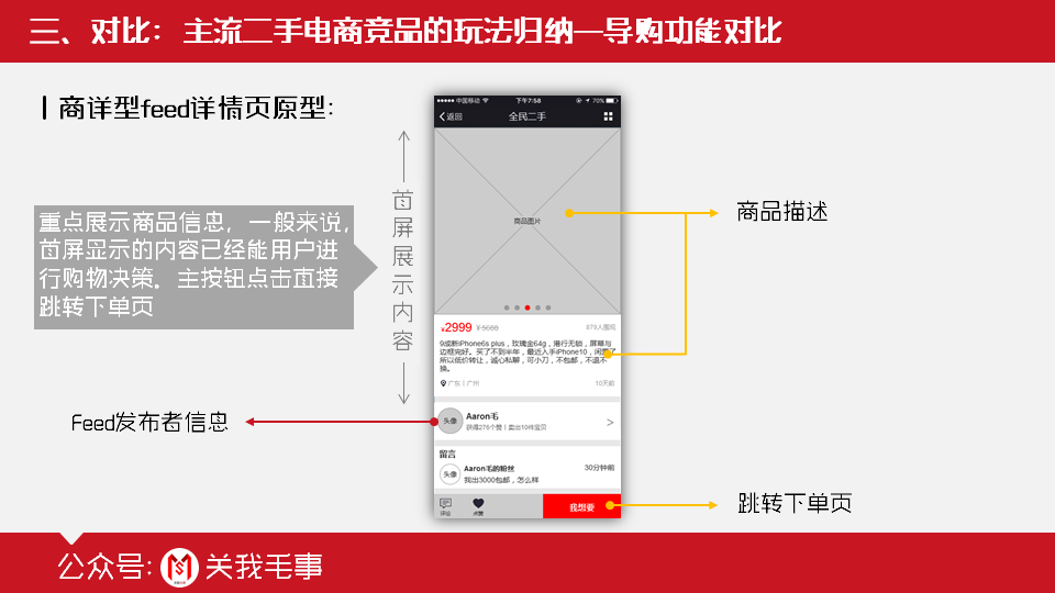 左图是闲鱼的截图,右图是转转。从截图中可以清楚看出来这两个竞品的feed详情页设计思路的不同点: