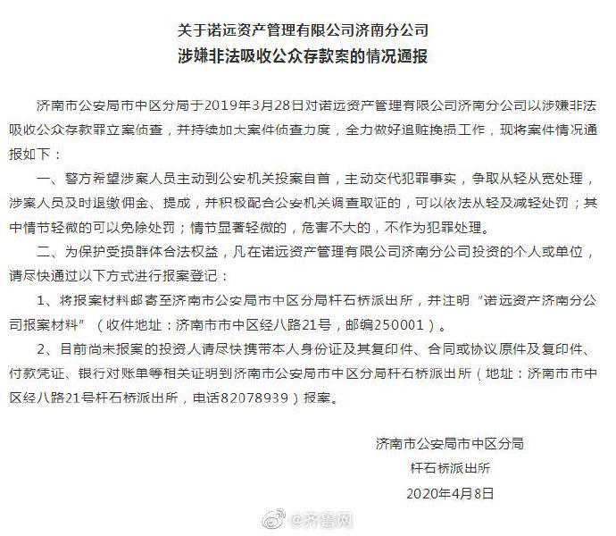 闪电警事【济南一公司涉嫌非法吸收公众存款,警方提醒:请主动投案自首!】4月9日,济南市公安局市中区分局发布案情通报,对于2019年3月28日对诺远资产管理有限公司济南分公司以涉嫌非法吸收公众存款罪立案侦查,全力做好追赃挽损工作,截至发稿前,济南市公安局就案件情况做出通报。一、警方希望涉案人员主动到公安机关投案自首,主动交代犯罪事实,争取从轻从宽处理,涉案人员及时退缴佣金、提成,并积极配合公安机关调查取证的,可以依法从轻及减轻处罚;其中情节轻微的可以免除处罚;情节显著轻微的,危害不大的,不作为犯罪处理。二、为保护受损群体合法权益,凡在诺远资产管理有限公司济南分公司投资的个人或单位,请尽快通过以下方式进行报案登记:1、将报案材料邮寄至济南市公安局市中区分局杆石桥派出所,并注明“诺远资产济南分公司报案材料”(收件地址:济南市市中区经八路21号,邮编250001)。2、目前尚未报案的投资人请尽快携带本人身份证及其复印件、合同或协议原件及复印件、付款凭证、银行对账单等相关证明到济南市公安局市中区分局杆石桥派出所(地址:济南市市中区经八路21号杆石桥派出所,电话82078939)报案。