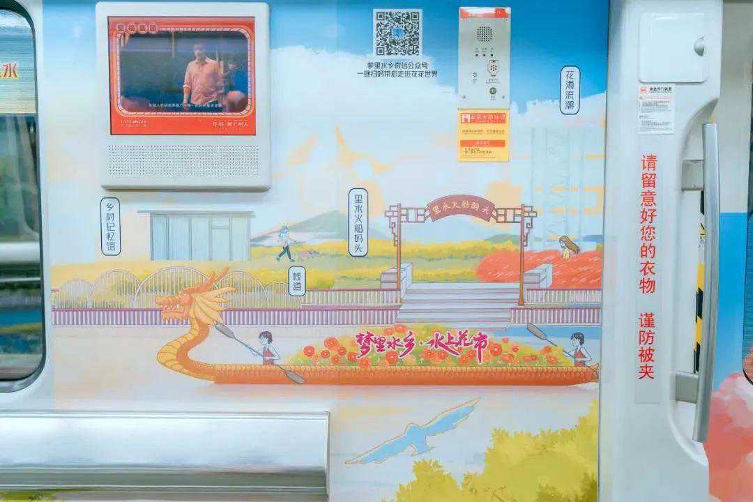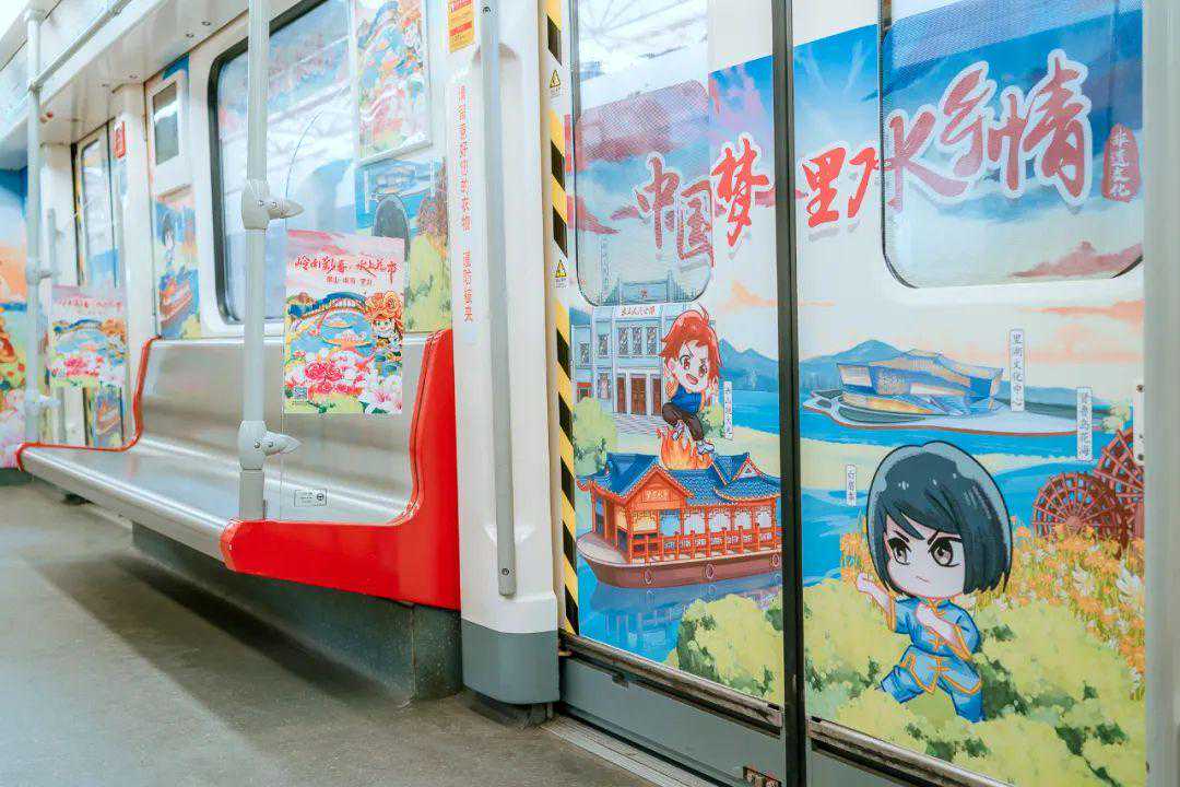 广州地铁3号线的“梦里水乡”专列,以“中国梦里水乡情”为主题,6节车厢的看板、车门贴、车窗贴等位置均贴上了采用国潮风格手绘作品,白眉拳、跳火光、醒狮、藤编……一系列非遗文化让人应接不暇。