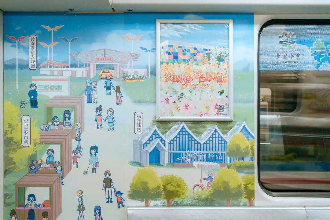 车厢以幸福像花儿一样为主题,用小清新的手绘风格描摹出南有梦里水乡风情游,北有岭南农业大观园两大连片乡村振兴精品示范线路。