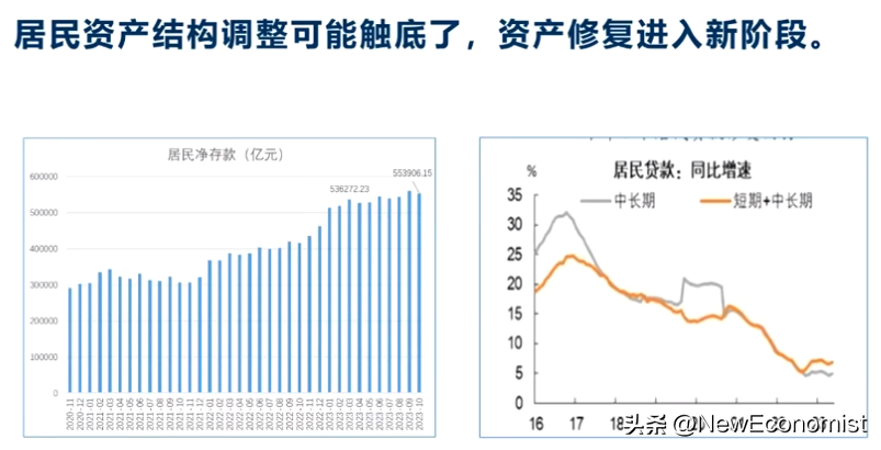 但是我们经常讲消费降级,消费降级里面很重要的一个就是居民整个的资产负债表调整的怎么样。我们目前给出的结论是什么?居民资产结构的调整可能触底了。也就是说大规模地抛售各种金融资产,大规模地停止购买房地产,同时大规模地增加居民的存款,那么这种是居民资产负债的一个大调整。这个过程我们认为最近开始接近尾声,当然这个接近尾声不等于马上就转好,因为它还可能有个底部。因此我们会看到的一个是什么?财富效应和收入效应,很可能使消费处于一个低水平均衡,消费升级的速度比预期要慢。