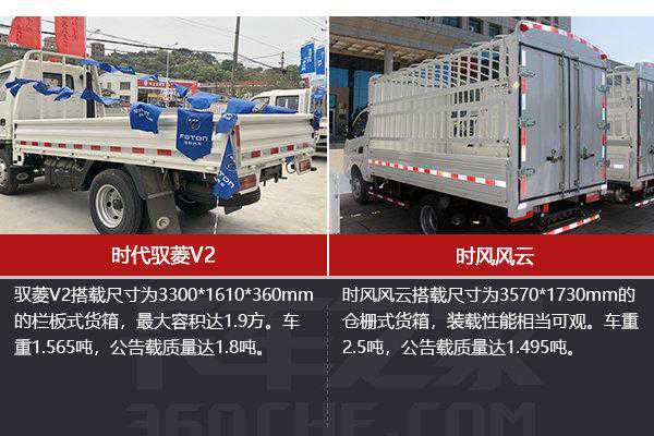 结语通过以上三方面的对比,我们能够看出两者在整体取向上的区别。在外观方面,驭菱V2外观更加的方正硬气,更加传统的外观设计让它更容易获得认可;而时风风云外观设计更加的年轻时尚,圆润的外观更讨年轻人的欢心。在内饰方面,驭菱V2更注重实用性,虽然在享受型配置上较为欠缺,但储物空间更加多样,时风风云的内饰设计则向乘用车靠拢,更加具有科技感。承载能力方面驭菱更具优势,更强的底盘配置以及更高的额定载质量都是它的优势所在。