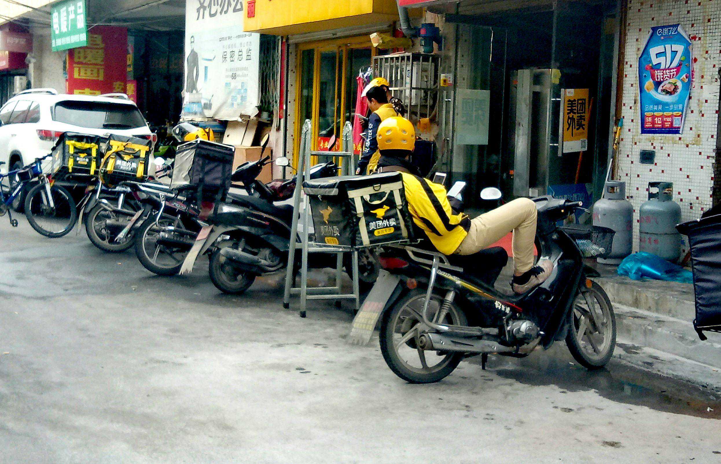 午餐高峰期过后能吃饭休息下。店门口停放一排摩托车。由于骑手送餐赶时间,超速、闯红灯、逆行等违返交通法规乱像太多。现在交警对摩托车查的很严,路口设卡查车,无证无牌抓到就扣车。甚至到晚上十点还在查,这让骑手总是提心吊胆。