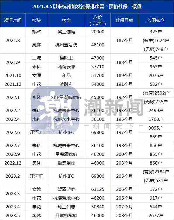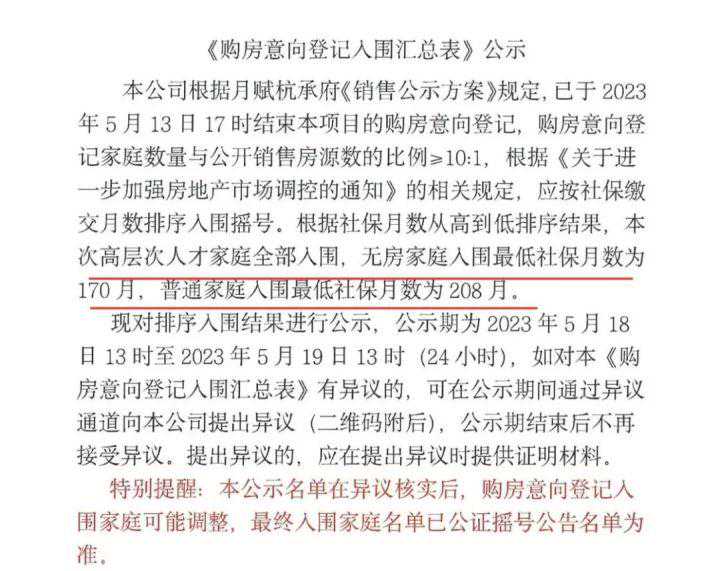 月赋杭承府报名登记中,高层次人才家庭全部入围,无房家庭入围最低社保170个月,普通有房家庭入围最低社保208个月,是从2006年1月份起以来的顶格社保。