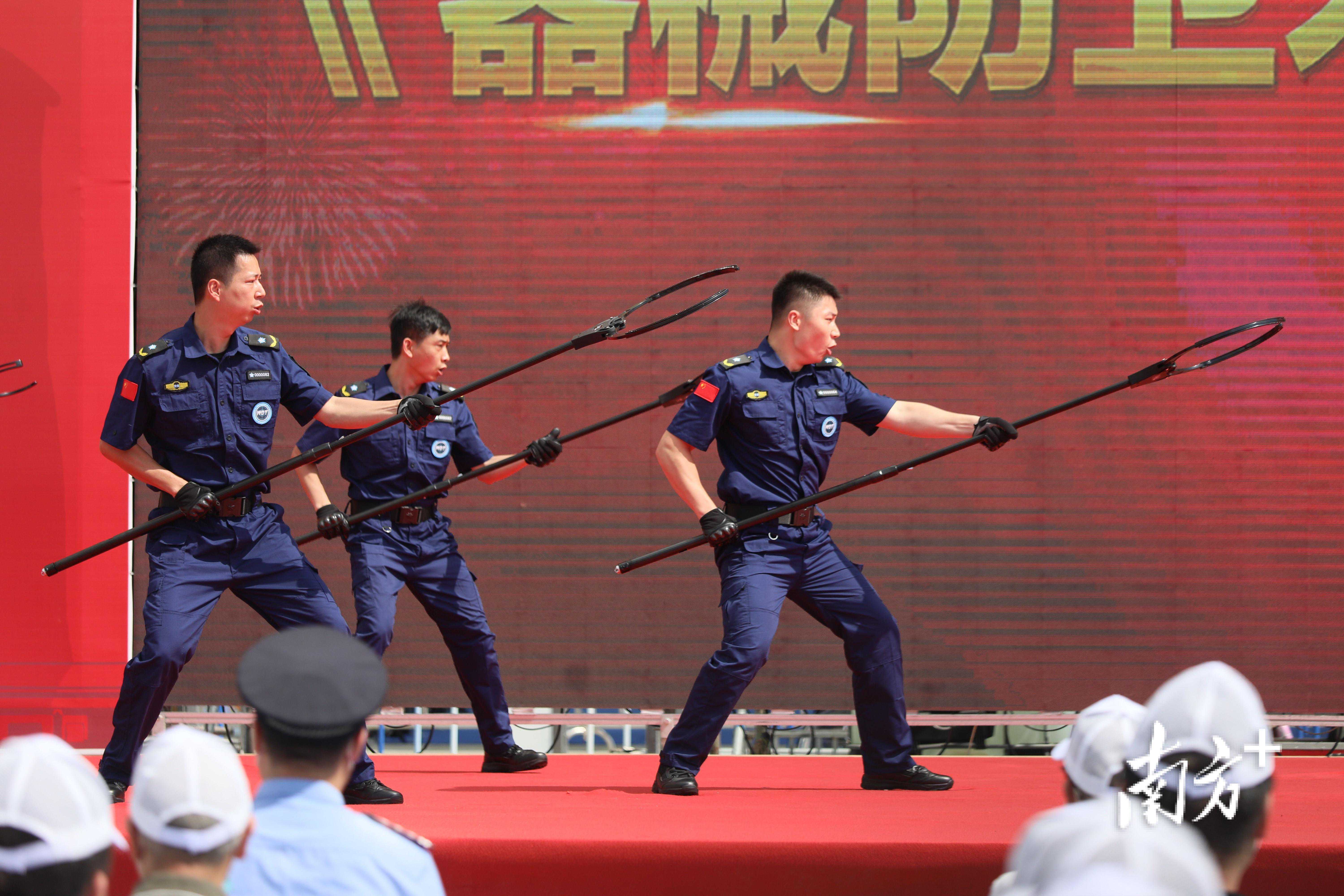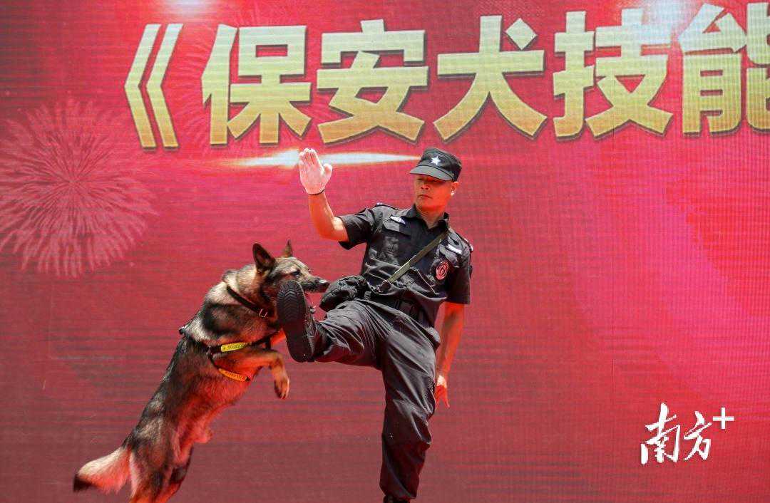 在展演板块里,各保安公司轮番上阵,精彩绝伦的现场表演赢得阵阵掌声。刚健挺拔的保安“勇者”,为观众们展示了综合格斗术、徒手防卫术、盾牌防卫术、钢叉防卫术、臂盾防卫术、甩棍防卫术等安保技能;才华横溢的保安“小姐姐”与“小哥哥”们一展歌喉与舞技,为观众带来合唱《珠海保安之歌》等节目;还有特邀表演嘉宾珠海乐游骑行平衡车俱乐部带来的酷炫车技表演;忠诚聪明的保安犬表演了服从、肢体障碍、送物衔取、扑咬、搜爆、跳圈等技能,观众们忍不住纷纷举起手机,对机敏灵活的保安犬进行抓拍。