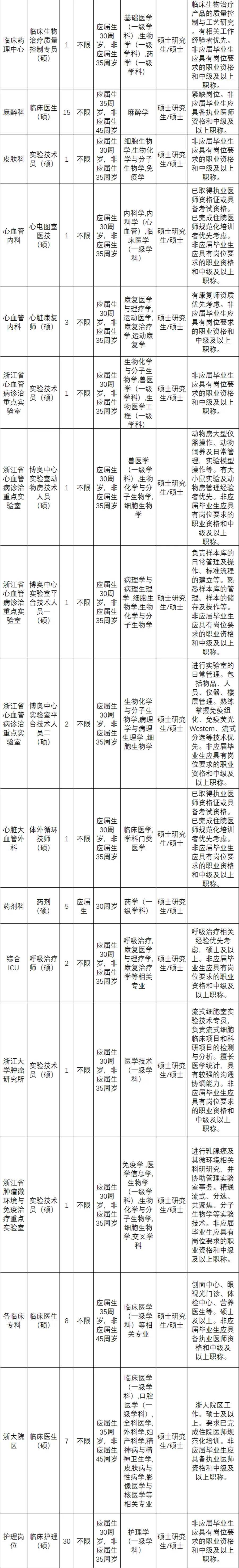 本次招聘需求为105个岗位496人。招聘岗位经限时集中报名、组织遴选并确定拟聘人员后,尚有空缺的医、药、技、护、科研等专业技术岗位,纳入浙江省省属事业单位特殊专业技术岗位招聘目录,在2024年度内继续招聘。