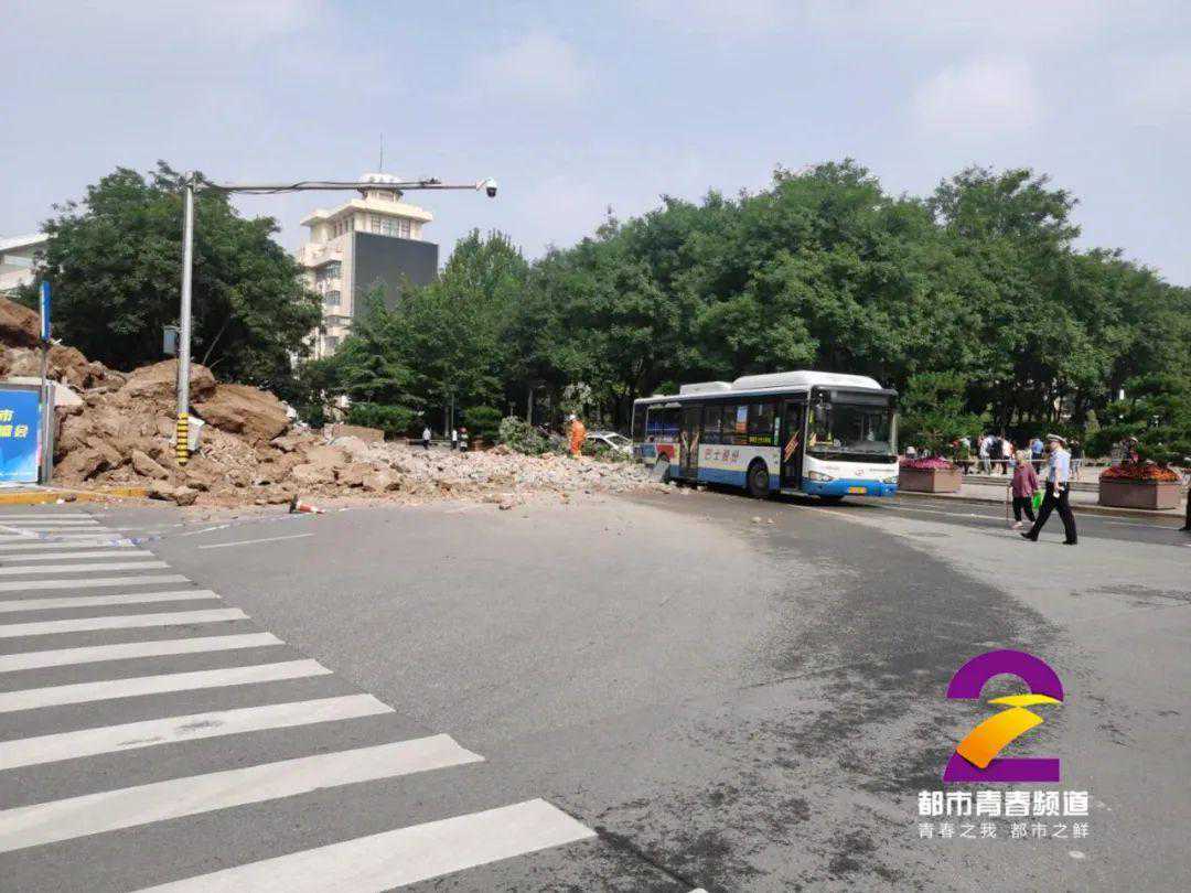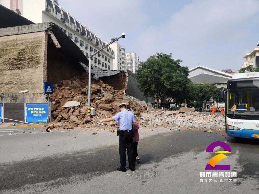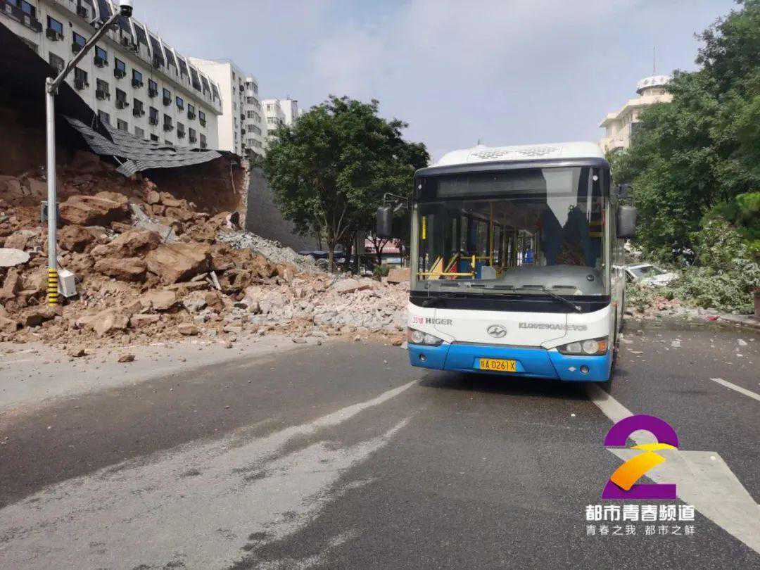 而坍塌下的树木和石块砸中旁边的一辆小轿车,