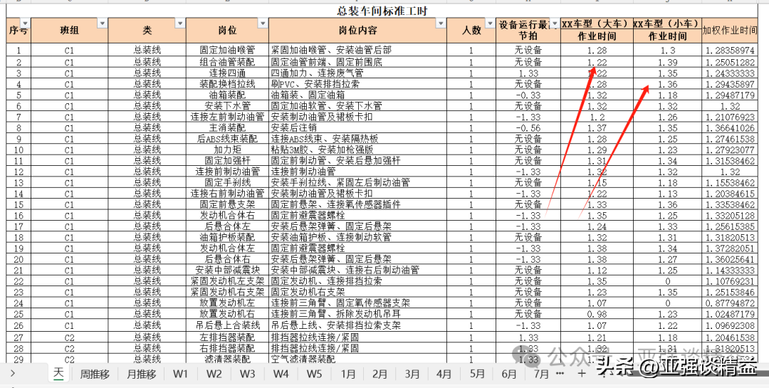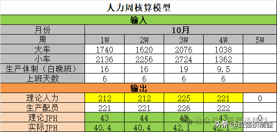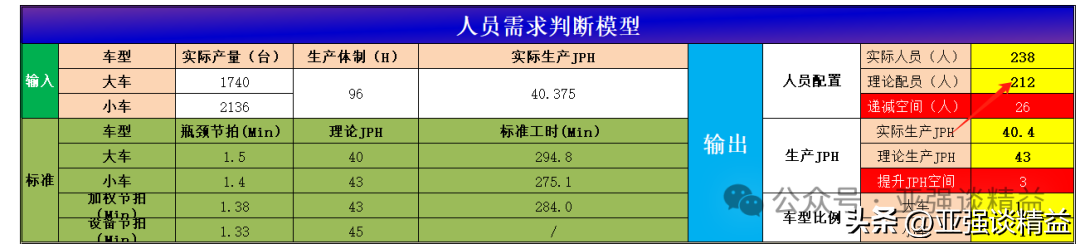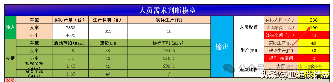 总结来说:此案例中举例的是两大类车型的均衡生产中的理论人员需求计算及安排。人员计算模型中的其他表格的含义和生产计划的排产合理性,生产成本的核算,浪费的递减、人员数量的管理,四个方面有关系,这里不在详细赘述,感兴趣的可留言,后续在慢慢展开。