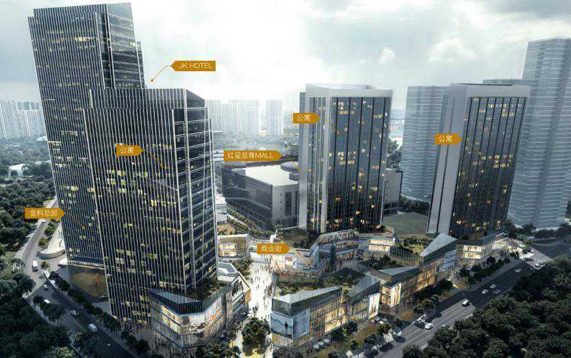 项目总体量超450,000平方米,由金科总部写字楼、金科中心·照母山商业、甲级商用写字楼、金科超五星级大酒店JKhotel、金科美寓、红星美凯龙至尊mall五大部分组成,是集行政办公、公共文化、生活休闲、商业娱乐、文化创意于一体的商业综合体;