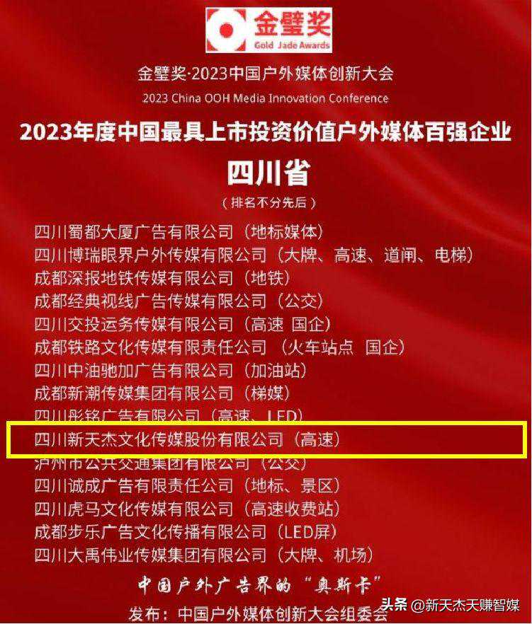 通过对户外媒体公司等海量数据严选,“金璧奖·中国户外媒体创新大会组委会”最新发布了“2023年度提中国最具上市投资价值户外媒体百强企业”提名入围名单。