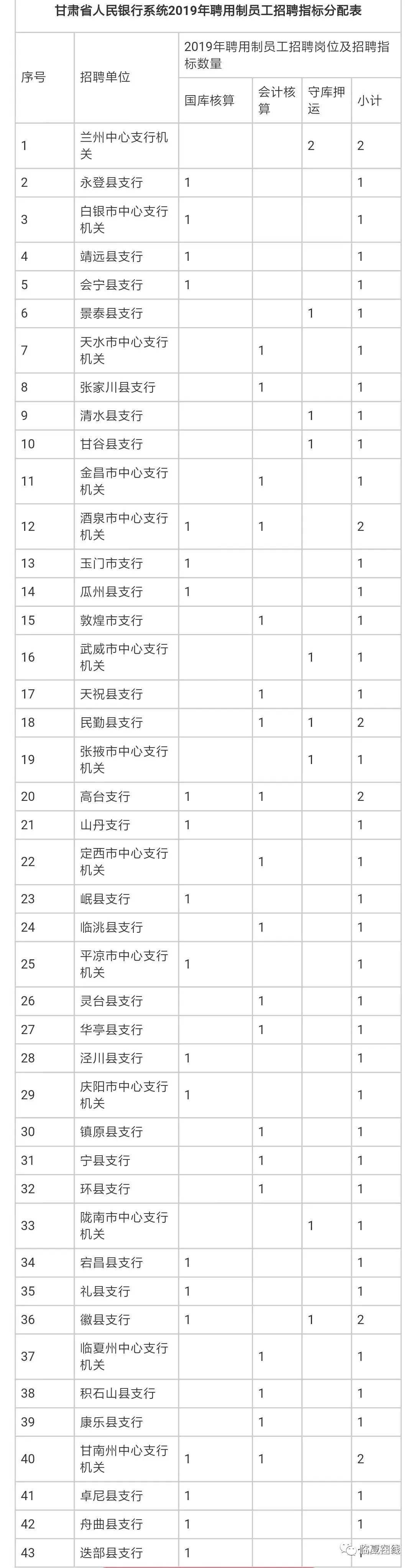 甘肃省人民银行系统聘用制员工主要招聘普通高等院校毕业生(2019年1月31日前毕业,不含定向培养、委托培养毕业生)和具有商业性金融机构、经济部门或相关专业工作经历的社会在职人员。其中,守库押运岗位招聘对象为军队转业干部、退役士兵和公安院校毕业生。