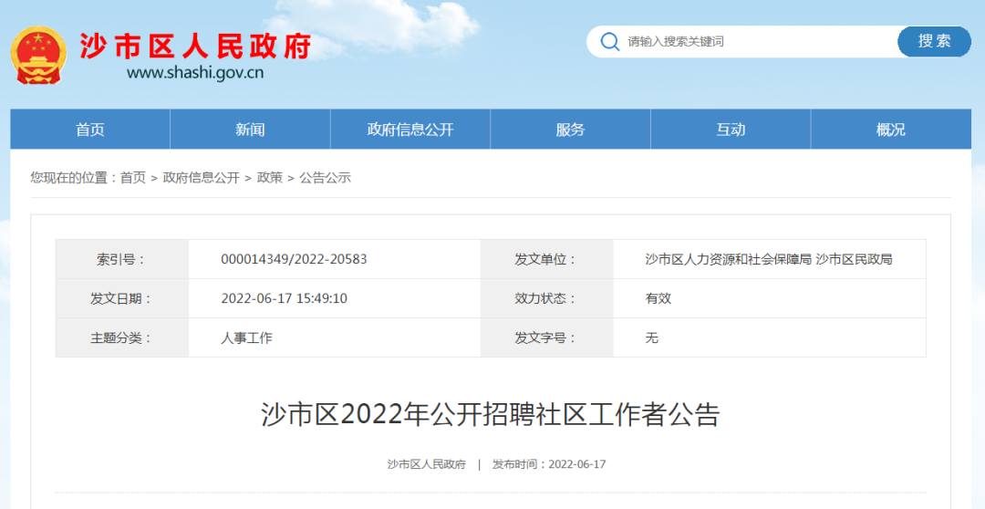 公开招聘工作的各项具体工作程序、重要事项和未尽事宜均在沙市区人民政府网站公告,由沙市区人力资源和社会保障局、沙市区民政局负责解释。