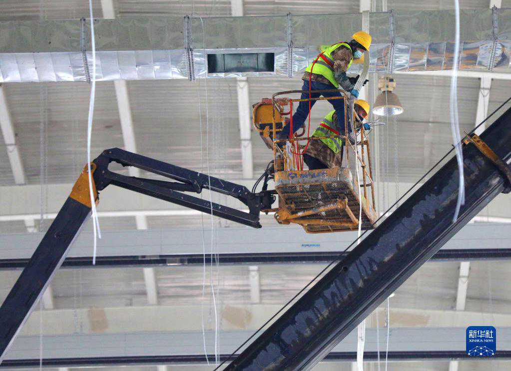 3月22日,在沈阳国际展览中心,施工工人加紧建设方舱医院。沈阳市积极应对严峻复杂的疫情形势,按照市防控指挥部总体工作部署,从3月20日晚开始,在沈阳国际展览中心建设方舱医院应急工程和健康驿站工程,提前准备必要的临时救治场所。多家施工单位紧密配合,倾力打造高质量临时救治工程,助力沈阳打赢抗疫保卫战。新华社记者杨青摄