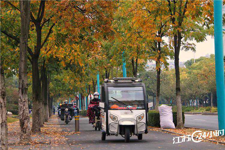 27日,张家港市,霜降过后,气温转凉,张家港市街头及公园里排列成行的乌柏、银杏等树叶渐泛金黄,色彩斑斓,片片“金叶”随风飘落,令人赏心悦目。