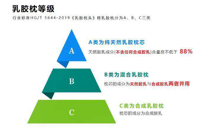 天然胶乳含量是指乳胶枕中天然胶乳(聚异戊二烯)含量的百分比。胶乳含量较高的乳胶枕,一般韧性、支撑性和抗螨抗菌的能力也较强。根据天然胶乳含量及成分的不同,行业标准HG/T5644—2019《乳胶枕头》将乳胶枕分为A、B、C三类。