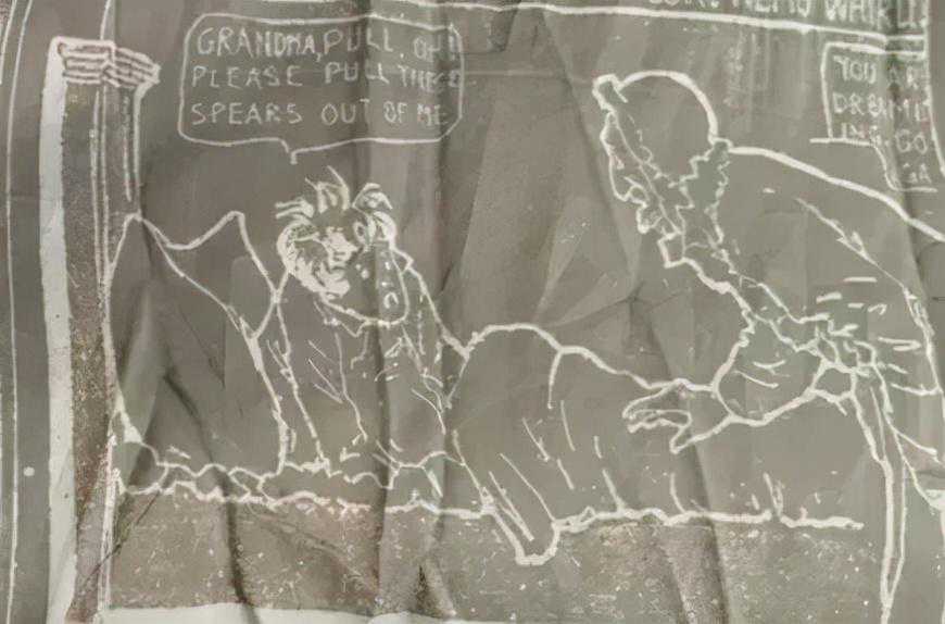 孩子虚弱地靠在床上,向人求助:“奶奶,请你帮我拔出这些箭头!”