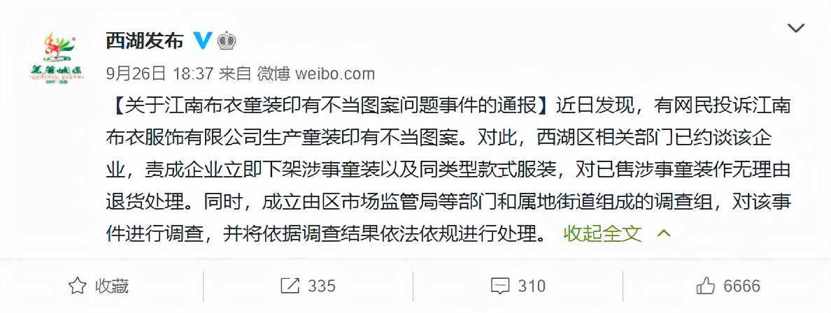 9月26日晚,浙江杭州西湖区人民政府官微发布通报:相关部门已经约谈江南布衣!