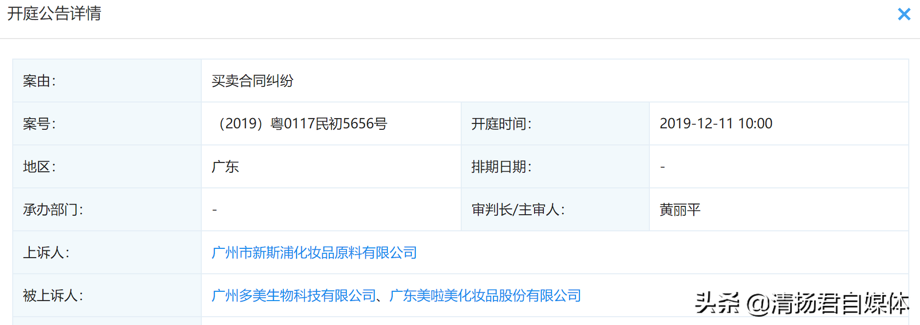 企查查数据显示,多美生物及其关联公司广东美啦美化妆品股份有限公司(以下简称“美啦美”)被广州市新斯浦化妆品原料有限公司(以下简称“新斯浦”)起诉,案号是《(2019)粤0117民初5656号》,案由是买卖合同纠纷,开庭日期为2019年12月11日上午10点。